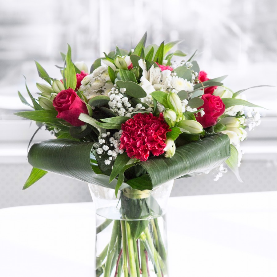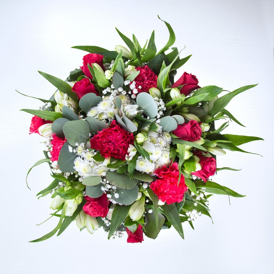 Our Radiant Harmony Bouquet is a perfect blend of white chrysanthemums, gypsophila, and red roses, harmoniously combined with carnations, white alstroemeria, and lush aspidistra leaves. This unique arrangement is designed to captivate and inspire, showcasing the finest quality and vibrant colors.